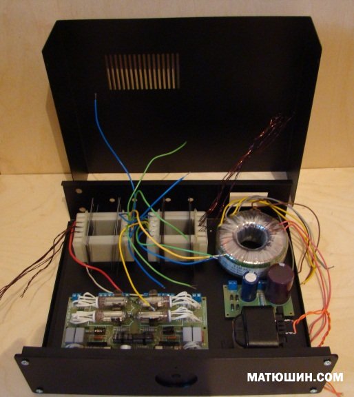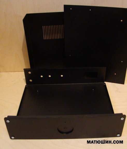 Корпус для двухтактного усилителя на 6П30Бр. Габаритные размеры : 80х250х300 мм, корпус состоит из монтажной панели, перегородки между блоком питания и усилительной частями, накладной (фронтальной)панели. верхней крышки и основания.