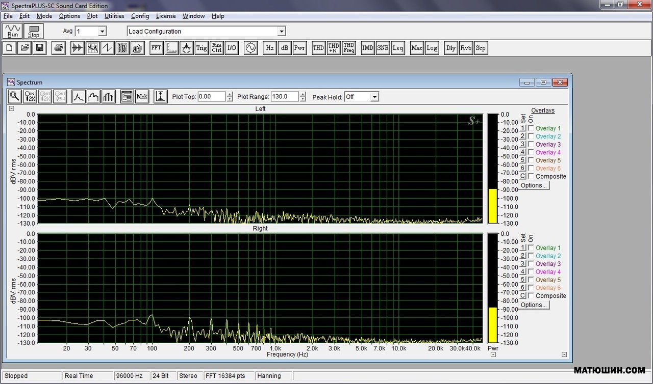 По спектроанализатору фон устройства с открытыми входными разъемами примерно -90 Дб, по шкале 0 Дб = 10 вольт, то соответственно по идее -90 Дб =200 микровольт,