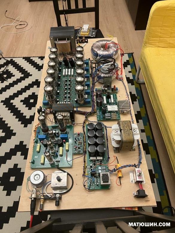 Однотактный усилитель на прямонакальном триоде 300В. Без обратной связи. Стабилизатор анодного напряжения входной лампы. Стабилизатор накала 300В с авто переключением полярности. Задержка включения Анодного напряжения. Дежурное питание. Полное управление с пульта. Селектор на три входа.