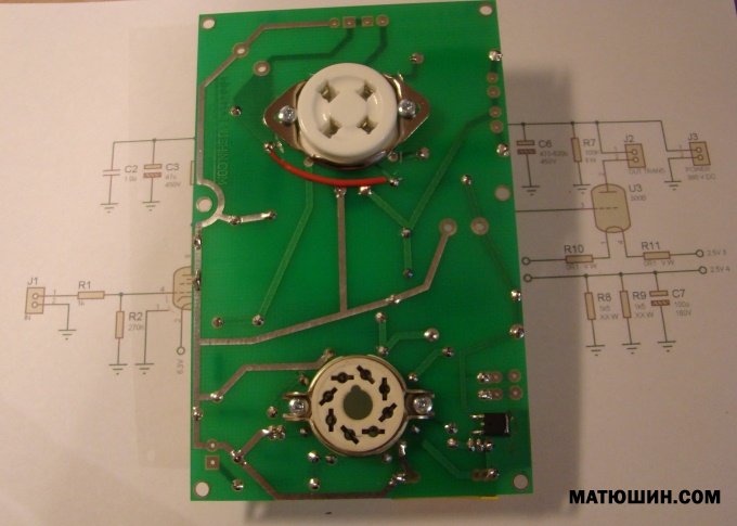 PS. есть не большой косячок на плате, крепление металическое панельки 300В наползает на дорожки (близко расположили), но это я считаю не криминально, поскольку эти проводники можно подрезать ( накал пойдет непосредственно на токоограничительные резисторы (0,1 Ом-5Вт), 2я нога сразу на разьем (out trans), под 3ю -сетка можно рядом просверлить доп. отверстие, сняв часть маски. Либо вообще закрепить панельку над платой!