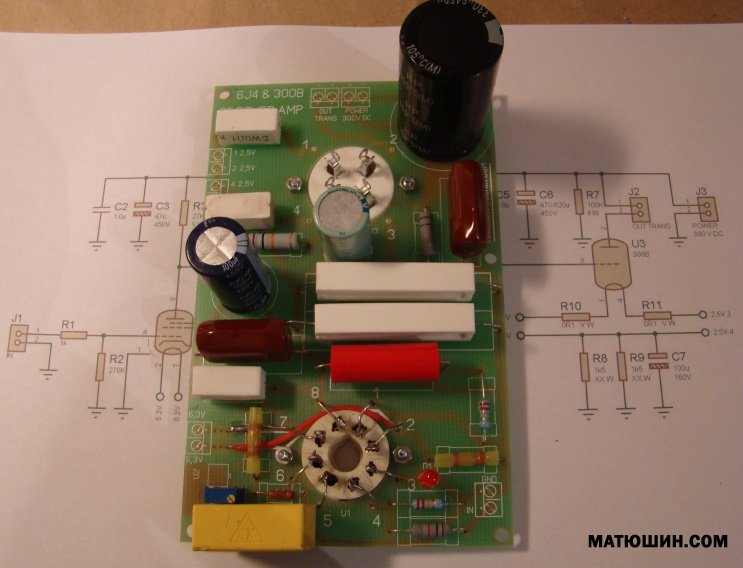 Кит набор для однотактного усилителя на прямонакальном триоде 300В. Это уже многократно отработанная схема связки пентода в данном случае 6Ж4 и триода 300В. Так же на раскачку вместо 6Ж4 можно установить (без изменения схемы), EF860. Панелька устанавливается так же в отверстие, крепится винтами и распаивается по месту.Пентодный режим можно в оперативном режиме задать регулятором-стабилизатором (микросхема со стороны печати). Накал 300В предполагается питать переменным током (положительно сказывается на качестве звука!). Фон при этом совсем не большой , порядка 20мВ на выходе с трансформатора!