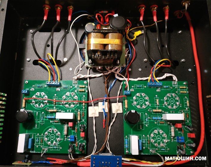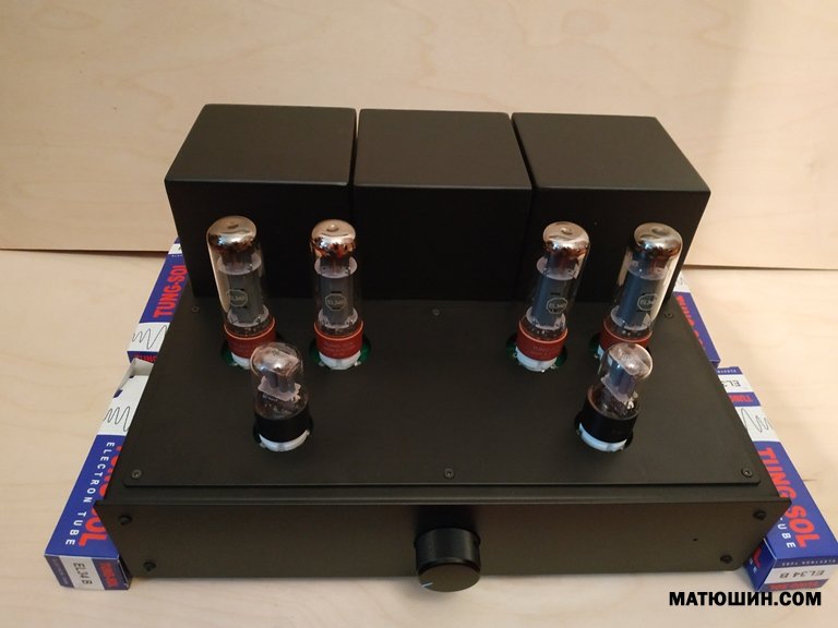 Усилитель изготовлен честно , на хорошей комплектации, выходные трансформаторы симметричные, силовой 200Вт тор, с хорошим запасом, двухсторонние печатные платы, панельки керамика. EL34 Tung-Sol Sovtek?мне если честно понравились, молодцы, на уровне, пока погреться им надо часов 20, но динамика и так видна 12.5 Вт на синусе 1В( не путать с rms) и 25 вт на 2 в синуса до клипинга, 30Вт В клипинге. По верху до 40т (-2дб). Вес порядка 20кг. Габариты 18см по колпакам 39,5 см ширина, 31см глубина