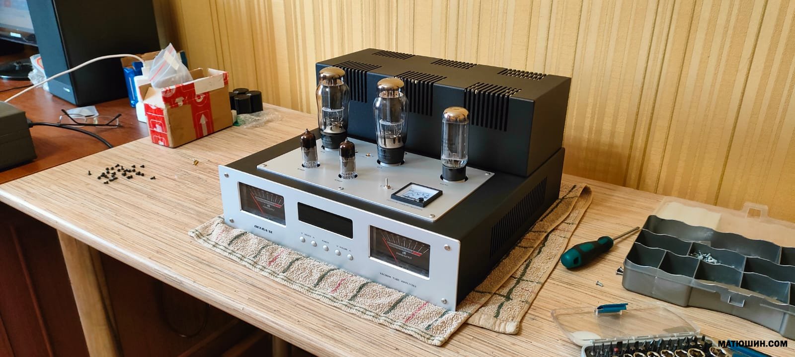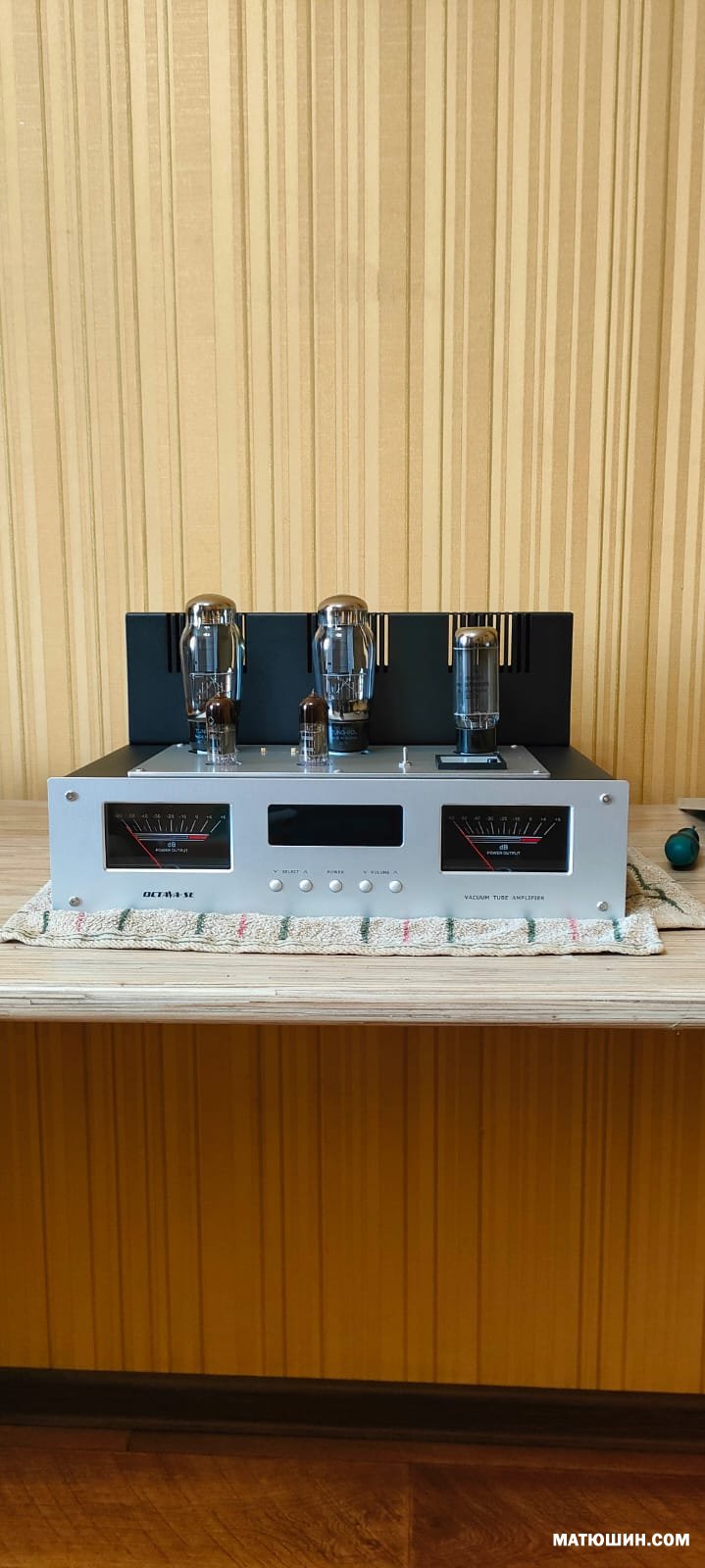 Совершенно новый проект однотактика на 6L6G ,в связке с тетродом 6э6п. Отлично строит сцену, прекрасное разрешение, особый способ конструкции выходного трансформатора,165 вт г.м М6, с симметричной намоткой ,все это дало положительный эффект,когда включаешь усилитель и не хочется выключать. Особенно стоит отметить возможность оперативно подстраивать режим работы ,при замене выходных ламп, для этого на накладку ,в верхней панели установлен вольтметр, а в в накладке выведены подстроечные резисторы под шлиц. Полоса 20-1 дб-20000-1дб, Выходная мощность 6Вт до клипинга.Базовый образец уже обкатан, запускаем в серию.