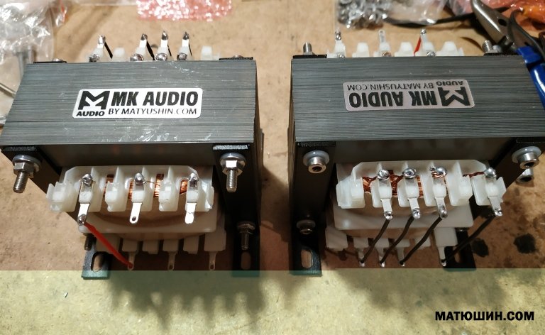 Трансформатор (полностью симметричный ) изготавливался с учетом просьб и пожеланий заказчика. Нагрузка 2,4, 8 Ом, ультралинейные отводы, секционирование 5+6, омическое РР (общее 170 Ом) , индуктивность порядка 55 Гн, железо М6 высокоиндуктивное, габаритная мощность 120Вт.. размеры: